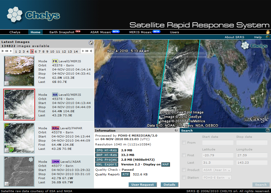 Meris was the first processor created for SRRS. It offers a highly advanced system of Quality Control and recovery for corrupted products. It is able to generate photo-realistic images at an astonishingly high speed starting from any Meris product (including Level0).